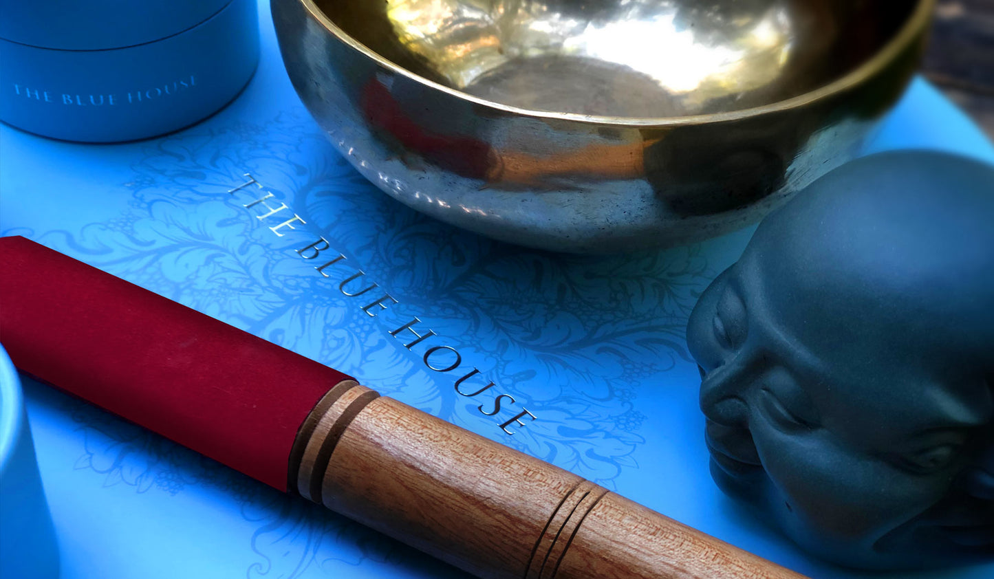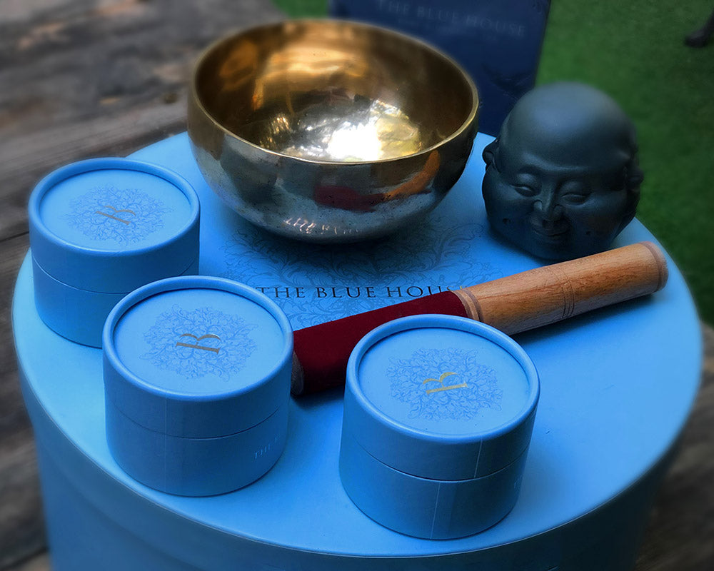 Three Emperor Buddha Oolong tea blends, housed in signature powder-blue cylindrical boxes, adorned with The Blue House emblem and crafted for moments of elevated reflection.